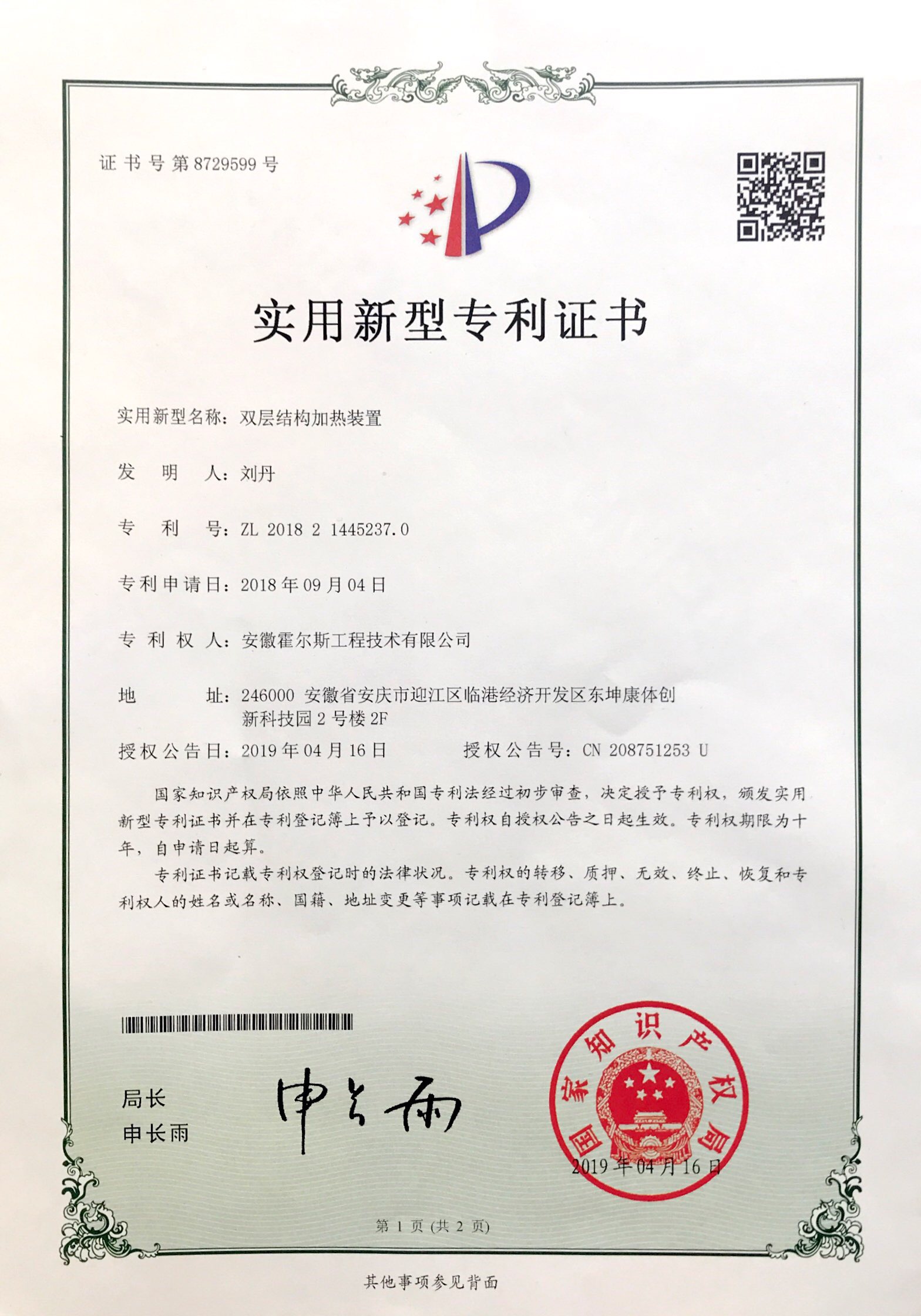 雙層結構加熱設計增加了空氣在加熱器中通過的時間,使得發熱管熱量更好傳遞給空氣,保證了對空氣溫度的要求,發熱管在發熱過程中,熱能有效的被加熱外管和加熱內管吸收,在空氣通過時,提高了熱接觸麵積,提高了熱轉化效率,同時有提高了能效利用率。近期,該項設計已成功獲得國家專利證書,這是午夜视频在线免费观看公司堅持自主研發的又一新的成果。